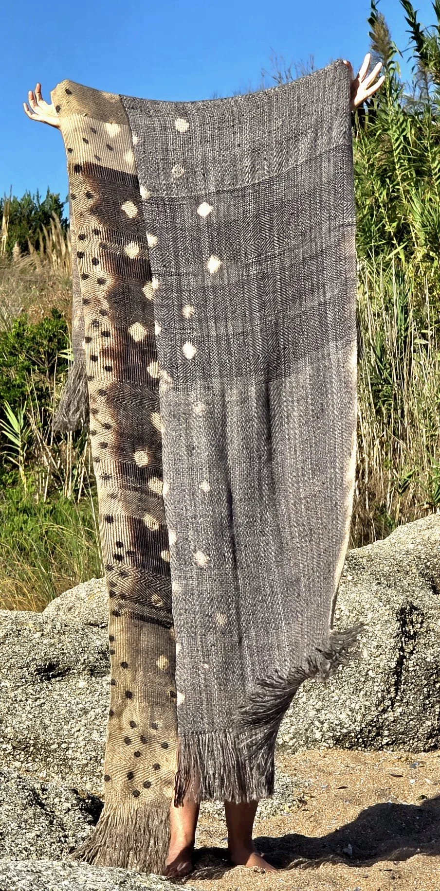 Handwoven on a four-shaft loom using hand-spun llama fiber from the Argentine Puna, alpaca, and silk from cocoons.