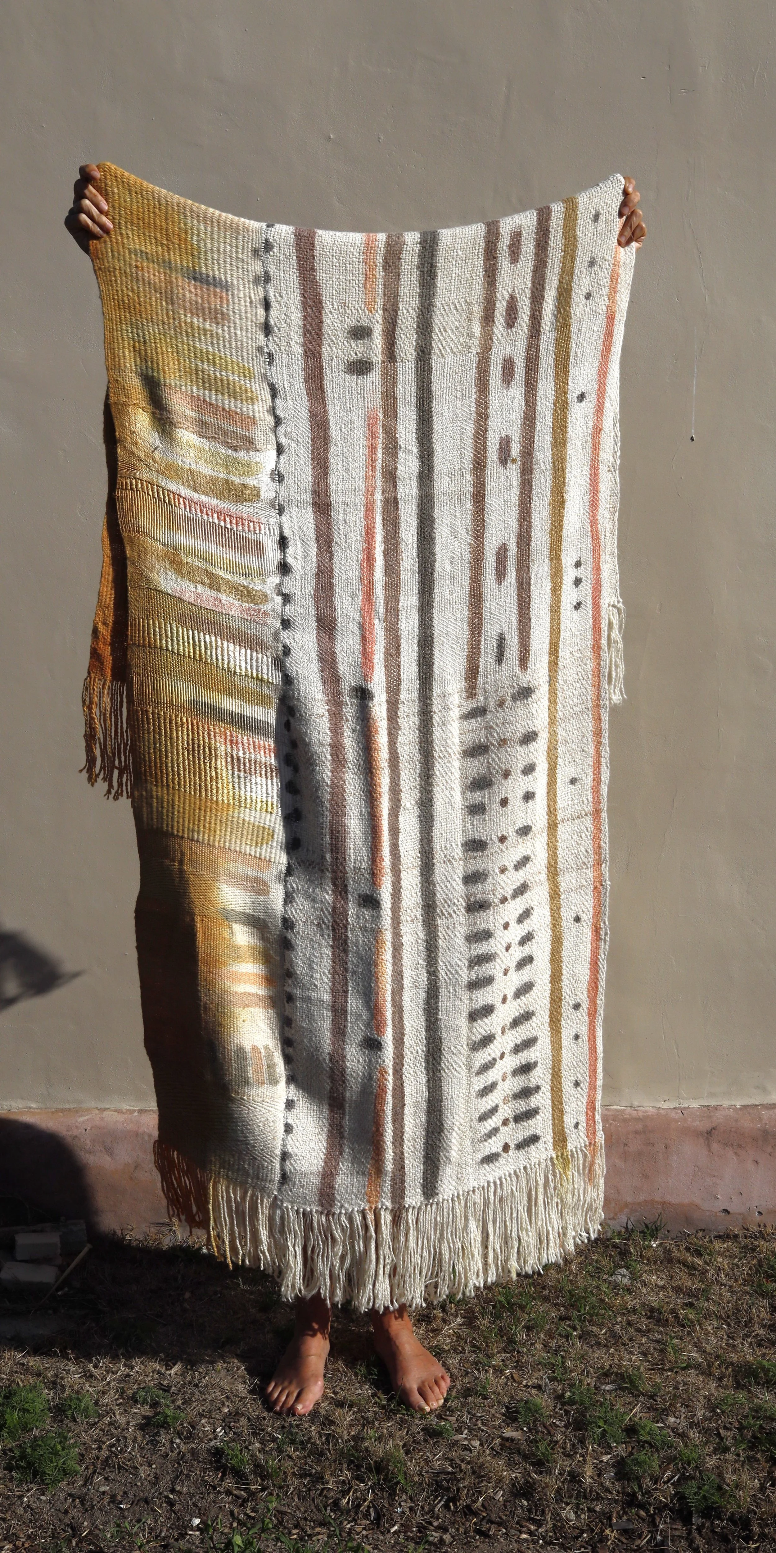 Handwoven on a four-shaft loom using hand-spun llama fiber from the Argentine Puna, alpaca, and silk from cocoons.